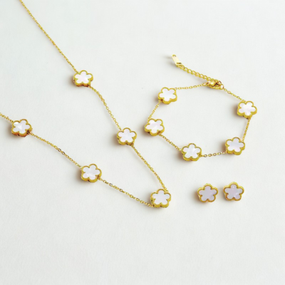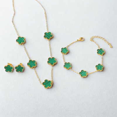 Nada de acessórios sem graça. Esse combo com colar + pulseira + brinco chega chegando com design em trevo da sorte — símbolo de sorte e elegância. É aquele detalhe que muda o jogo e transforma qualquer look em visual de capa de revista.